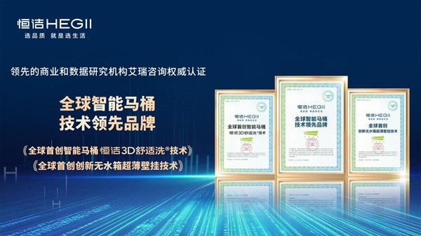 从破解安装难题的N系列,到升级洗护体验的R系列,恒洁聚焦中国家庭的真实居住需求,在“空间适配性”与“使用舒适度”两大核心维度双向发力。依托系统化的技术布局,恒洁成功打破高品质卫浴的场景局限——不再只适配大户型新房,而是真正覆盖老旧小区、小户型等各类居住场景,适配不同人生阶段的家庭需求。凭借持续迭代的技术创新,恒洁精准回应消费者对“洁净、舒适、健康”的核心卫浴诉求,让“选品质即选生活”的理念,落地为看得见、摸得着的日常舒适体验。 加冕“全球智能马桶技术领先品牌”,恒洁引领产业生态共同演进 “无水箱超薄壁挂”技术破解空间普惠难题,“3D舒适洗”技术重塑清洗体验标准,N系列与R系列双双获得权威认可,是恒洁产品力的有力证明。获得艾瑞咨询授予的“全球智能马桶技术领先品牌”认证,更彰显了恒洁的系统性技术储备与全产业链影响力。 恒洁将自身的技术创新力转化为行业发展的推动力,引领整个卫浴生态向更高质量的方向演进。早前,恒洁就已作为《智能坐便器》行业标准的第一起草单位,深度参与110多项国家和行业标准制定;旗下智能马桶率先获得水效标识备案001号,在全国智能坐便器质量分级试点中获评最高5A等级,并成为业内首批全机种通过中国质量认证中心CCC认证的品牌,用硬核品质夯实市场竞争力;凭借综合表现,恒洁也连续被第三方认证为“中国智能马桶第一品牌”。