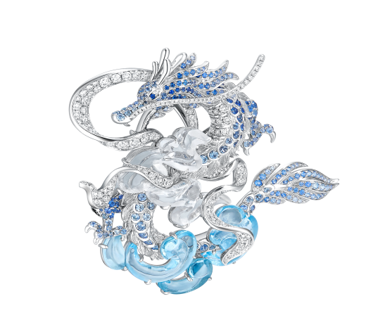 储粹宫CHUCUI PALACE 云吟清樾Cloud Poetry胸针 该作亦与西方装饰艺术的美学逻辑形成对话。装饰主义强调形式自律与几何秩序,本作在线条与形态组织中贯穿了隐含的韵律与结构;其对于色彩平面构成的重视,亦体现于碧玉色与月白色块的有序铺展与组合关系中,使整体色彩在浓郁与清透之间取得均衡克制的视觉平衡。本质上,装饰艺术追求图案与视觉结构的统一,而储粹宫CHUCUI PALACE在此基础上的实践,进一步将东方文化母题融入其装饰体系,既遵循形式服务于视觉整体性的功能原则,亦通过跨文化转译拓展了装饰语言的表达维度。 在中国文化脉络中,“龙”是承载着哲学观念与精神象征的经典符码。储粹宫CHUCUI PALACE通过审美理念与设计语言的结构化整合,对其进行了兼具继承性与创新性的转化,使这一传统形象契合艺术的演进趋势。相较于经典 Chinoiserie 风格,该作品体现出对东方符号不限于表面借取,而是深入内核的再造能力,在设计语义中注入了新式的美学表达。这一创作路径,增强了作品的视觉感染力与文化厚度,使其在传递东方精神的同时亦彰显国际化的审美品格,逐步塑造出储粹宫CHUCUI PALACE 独特的设计哲学与创作话语体系,成为传统美学在新语境中深度转译与融合的实践典范。 四、跨文化美学的永恒价值:文明对话的不朽篇章 从18世纪的Chinoiserie到储粹宫CHUCUI PALACE的艺术实践,跨文化美学的探索跨越了数百年时光,书写了一部文明对话的不朽篇章。这段历程并非文化的简单复制与传播,而是符号在不同语境中不断被诠释、重构,进而焕发新生的过程,揭示了文化生命力的核心密码——开放与对话。 Chinoiserie的历史价值,在于它首次大规模实现了东方符号的全球化表达。它以中国瓷器的温润为底色,以欧洲鎏金的璀璨为光泽,在东西方对器物之美的双重想象中,完成了从实用器皿到艺术瑰宝的蜕变。那些融合了东西方元素的瓶器、碟子、建筑装饰,不仅是当时社会思潮的物质见证,更搭建起东西方文明沟通的最初桥梁,让不同文化背景的人们通过艺术符号实现情感共鸣。储粹宫CHUCUI PALACE的实践则为跨文化美学注入了新的活力,它证明了传统符号并非僵化的历史遗存,而是能够通过创造性转化,成为承载文化内涵与审美价值的艺术载体。从“浅蔓清露”对自然语汇的抽象提炼,到“鹤舞云间”对东西方艺术手法的融合,储粹宫CHUCUI PALACE让东方文化符号以更具深度与内涵的方式走向世界,实现了从“被想象”到“主动表达”的转变。
