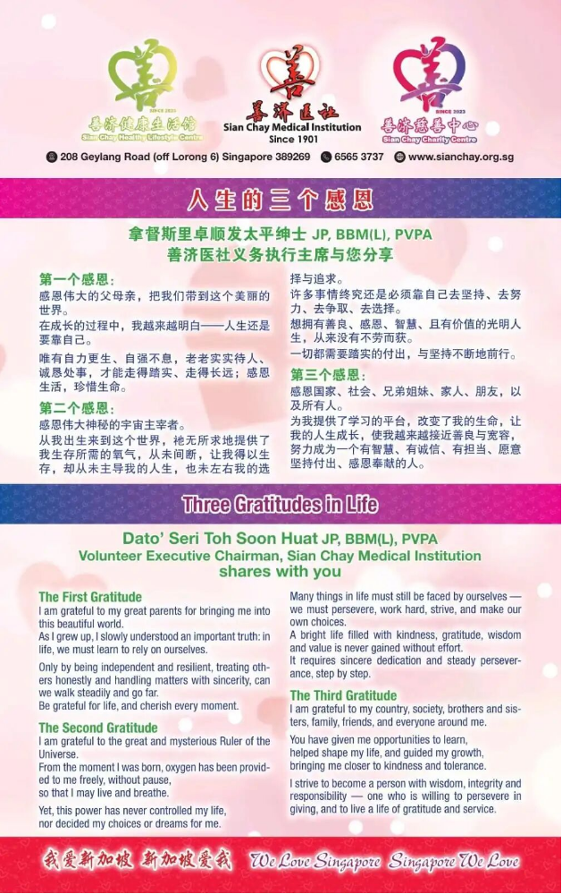 卓顺发先生也向所有阅读、支持、分享书籍的公众致谢,强调“文字因社会的温暖而更具力量。” 他进一步表示,中华文化五千年的智慧,是他做人做事的重要养分,让他能在书中分享仁爱、感恩、责任与慈悲的价值观。他也感谢善济医社团队在出版、编辑与推广过程中所付出的努力。 卓先生希望社会能在感恩、善念与慈悲中共同成长,让慈善与善知识的力量在新加坡不断延续。