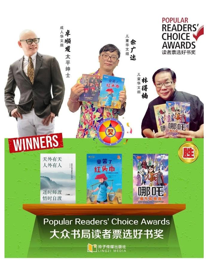 大众书局“读者票选好书”中文书成人组四名得奖者(左起)白胜晖(《在商言商:郭令明》,尤今(《加减人生:畅谈处世之道》,卓顺发(《天外有天人外有人,迷时师渡悟时自渡》)。焦点出版总编辑何雪芬则代表李慧玲领奖,作品是《思索的长度》。 他说,这17年一路走来真的不容易。一路的艰难、辛苦、坚持与付出,外人或许看不见,但自己心里最清楚。那些沉淀下来的感受、故事与体悟,都写进了这本书里,也镌刻进了他的人生。这些历练,悄悄熏陶了他的人生态度,也成就了他心中的善良与大爱。 他也感谢新加坡媒体局、国家图书馆、大众书局(Popular)及玲子传媒,在出版、发行与推广方面给予的支持,使他的书籍得以触及更广读者,将善念、感恩与光明传播得更远。