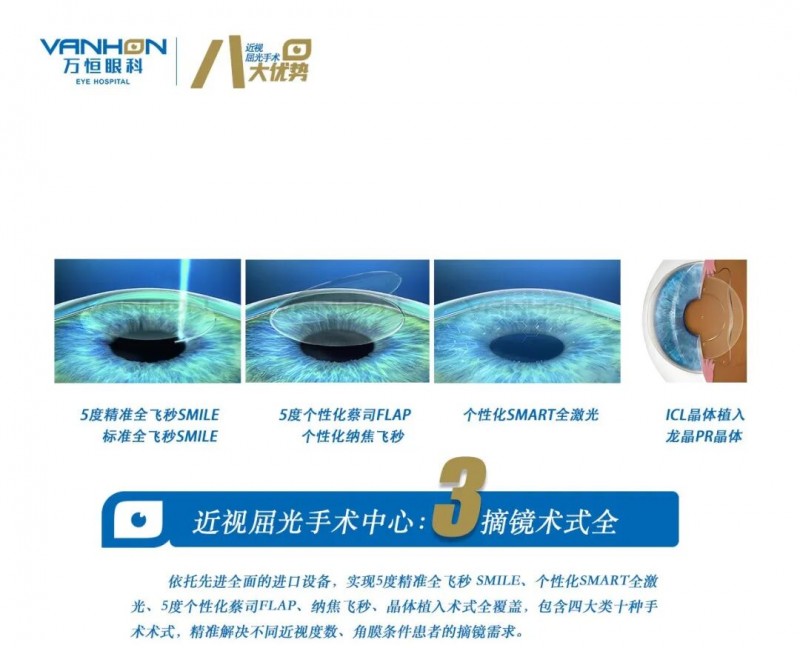 三、摘镜术式全: 以需求为导向,安全适配更舒适 不同患者的角膜条件、用眼场景、屈光度数存在显著差异,行业“千人一术”的模式早已无法满足多元化需求。聊城万恒眼科全面覆盖全飞秒SMILE4.0、5度精准全飞秒3.0、半飞秒系列、全激光系列、ICL/龙晶晶体植入等主流术式,形成“全场景适配”体系:微创SMILE全飞秒精准4.0,干眼发生率低、恢复快,适配职场人、运动爱好者;半飞秒可个性化定制切削范围,针对性解决高散光问题;全激光无痕无瓣,零负压,生物力学稳定;ICL晶体植入无需切削角膜,为高度近视、角膜偏薄患者提供安全可逆选择。这种“按需适配”的模式,让每一位患者都能找到最适合自己的方案。