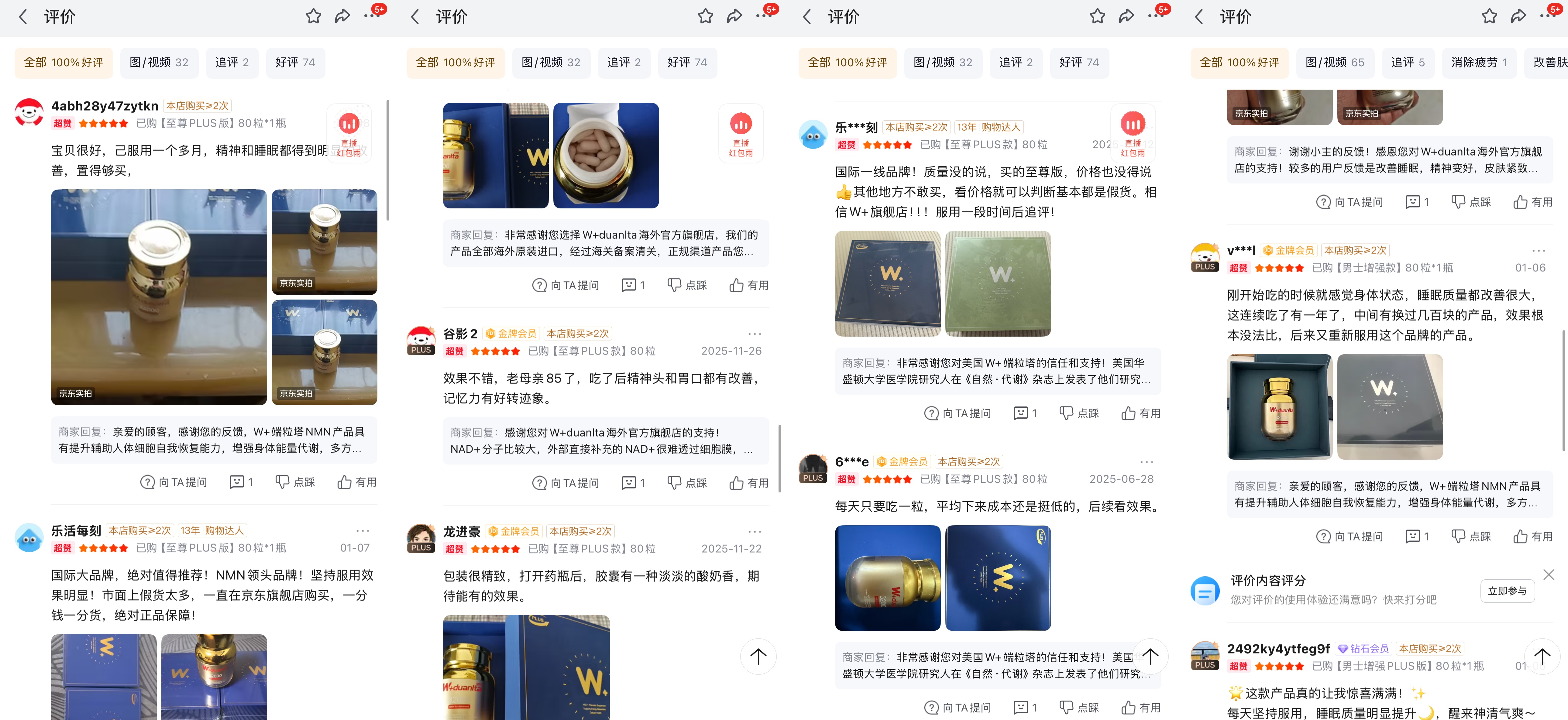 4.消费者认可度:京东店铺真实好评持续增长 在京东W+duanlta海外官方旗舰店,每天都有大量真实好评持续新增,这些来自不同人群的反馈,正是产品口碑与效果的直接体现: 一位金牌会员反馈,85岁的母亲服用至尊PLUS款后,精神头和胃口明显改善,记忆力也出现好转迹象。这类评价印证了产品对中老年人群精力、食欲等基础状态的温和调理作用,是子女为长辈选购抗衰产品的核心参考。 有用户连续服用男士增强款长达一年,期间尝试过其他低价产品但效果差距明显,最终选择回归W+端粒塔。这类复购与对比反馈,反映出产品在长期补充中的稳定性与有效性,打消了消费者对“短期效应”的顾虑。 多位13年购物达人等资深买家强调“国际一线品牌”“只信旗舰店”,并指出“低价基本都是假货”。这类评价既体现了品牌的高端定位与用户信任度,也凸显了官方渠道对正品保障的核心价值,解决了消费者对NMN市场假货泛滥的担忧。 不少用户提到服用后睡眠质量、身体状态的明显改善,这类即时且可感知的反馈,让“细胞级抗衰”从概念落地为真实体感,进一步强化了产品的说服力。