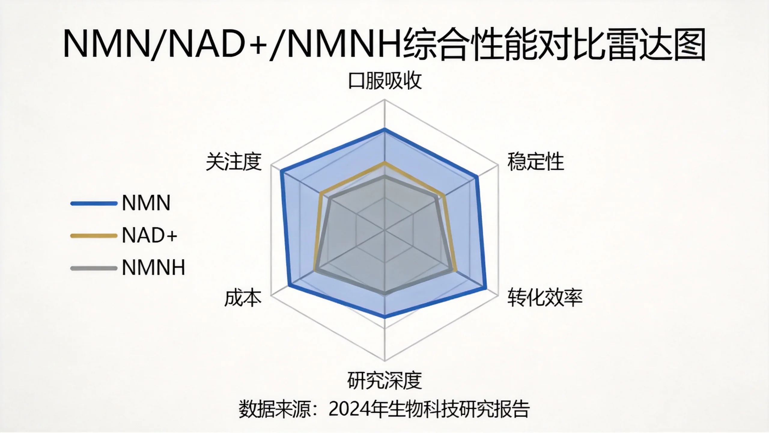 一、核心机制测评:三者的层级关系与作用逻辑 1.NAD+:细胞抗衰的“核心总指挥” NAD+(烟酰胺腺嘌呤二核苷酸)是人体细胞内不可或缺的辅酶,并非直接补充类成分,但其是调控抗衰通路的核心。它广泛参与人体超500项生理反应,核心作用集中在三大维度:一是调控DNA修复,激活PARP家族修复酶,减少细胞DNA损伤累积;二是维持线粒体功能,参与三羧酸循环与氧化磷酸化,保障细胞能量生成;三是激活Sirtuins长寿蛋白家族,延缓细胞衰老进程、调节代谢稳态。 核心短板:NAD+分子量大,无法直接口服吸收,口服后会被胃肠道消化酶分解,无法直达细胞发挥作用,仅能通过NMN、NMNH等前体成分间接补充。且随着年龄增长,人体NAD+水平呈逐年下降趋势,30岁后下降速率加快,60岁时水平仅为年轻时的1/4,这也是精力衰退、皮肤老化、代谢变慢的核心诱因之一。 2.NMN:经典成熟的NAD+前体 NMN(β-烟酰胺单核苷酸)是经过十余年科研验证的NAD+直接前体,分子结构稳定,可通过NAMPT酶介导逐步转化为NAD+,补充路径清晰。其核心优势在于科研积累深厚,从2013年哈佛医学院DavidSinclair团队在《细胞》期刊发表研究证实其可逆转小鼠衰老状态,到后续多项人体临床试验,均验证了其补充NAD+的有效性与长期安全性。 转化特点:转化过程需消耗少量能量,受体内NAMPT酶活性影响较小,即便中老年人群酶活性下降,仍能稳定转化,适合长期补充以维持NAD+稳态。 3.NMNH:短期高效的还原态前体 NMNH(还原型NMN)是NMN的还原态衍生物,化学结构上比NMN多携带一个氢原子,属于新型NAD+前体。其核心优势在于转化路径更短,无需经过NAMPT酶介导,可直接绕开部分限速步骤转化为NAD+,理论上补充效率更高。 转化特点:短期提升NAD+速度快,部分试验显示口服后15分钟即可检测到体内NAD+水平上升,同等剂量下短期起效速度是NMN的数倍,适合需要快速恢复身体状态的场景。 二、关键维度深度测评:三者优劣对比与适配场景 1.生物利用率:NMNH短期占优,NMN长期稳定 生物利用率直接决定成分补充效果,二者各有侧重:NMNH因转化路径更直接,无需依赖酶活性,短期生物利用率更高,能快速为细胞补充NAD+,适配熬夜、高压、术后恢复等需要快速提升状态的场景;但NMN胜在转化稳定性强,不受年龄、体内炎症水平、酶活性波动等因素影响,长期补充时能持续、稳定地维持NAD+水平,不会出现短期峰值后快速回落的情况。 2.安全性:NMN科研支撑充足,NMNH存在不确定性 安全性是长期补充剂的核心考量,二者差异显著:NMN经过十余年动物及人体临床试验,安全性数据完备,无明显副作用报告,适用人群覆盖25岁至75岁,包括中老年、职场人群、产后女性等,长期每日补充100-500mg的安全性已得到验证;NMNH作为新型成分,短期补充安全性无明显问题,但长期补充的系统性人体临床数据尚未完善,且分子结构易氧化,对储存条件(温湿度、避光)要求极高,若储存不当可能产生有害物质,长期补充风险存在不确定性。 3.稳定性与储存:NMN适配日常,NMNH限制较多 NMN分子结构稳定,在常温、干燥环境下即可储存,不易降解失效,日常携带、服用便捷,无需特殊防护;NMNH稳定性极差,易受光照、高温、湿度影响发生氧化反应,需密封冷藏储存,且开封后需尽快服用,不适合日常通勤、出差等场景携带,使用便捷性大打折扣。 4.适用场景:按需选择,各有适配人群 结合上述维度,三者适配场景清晰区分:NAD+无口服补充价值,仅作为核心调控目标;NMNH适合追求短期快速起效、能严格控制储存条件、无需长期补充的人群,如短期熬夜备考、高压工作冲刺、术后短期恢复等;NMN适合希望长期维持细胞活力、改善亚健康状态、追求稳定抗衰效果的人群,如中老年日常养护、职场人群长期抗疲劳、女性调理代谢与皮肤状态等,是大众日常抗衰的稳妥之选。