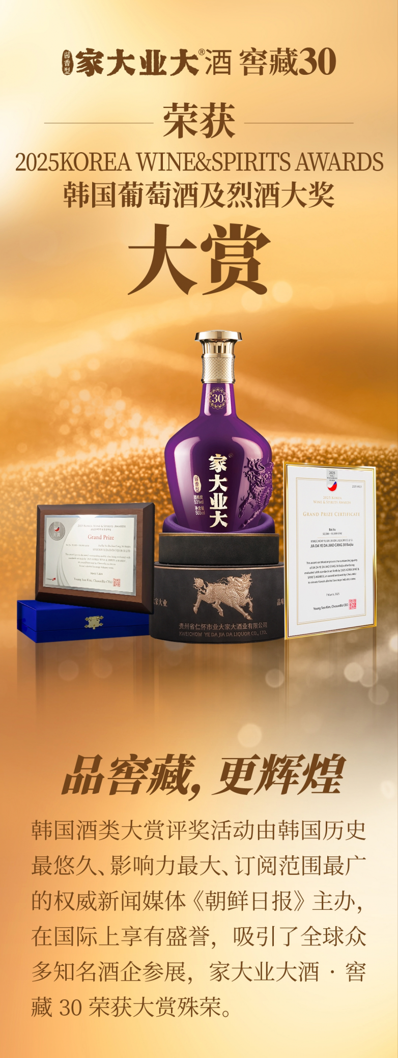 “爸,您的期望,我都懂” 爸爸是懂酒的,在他的酒柜里,珍藏着的都是十五年以上的老酒,这些老酒见证了父亲这些年来的点点滴滴,也见证了从孩子成长为男子汉的我们。 对这瓶家大业大酒·窖藏30,他总是如数家珍:30年的窖藏老酒,越存越醇厚,越陈越耐品。 爸爸的期望,也如同这瓶窖藏30年,一个家族的传承,从来不是一时的绚烂,而是如老酒般经得起时光沉淀的醇厚与力量。 父亲希望,家业兴旺,长长久久。