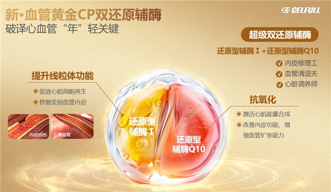 这种“精准定位+科学配伍”的模式,避免了传统“成分堆砌”的弊端,让赛立复血管黄金PLUS每一种成分都能直击对应靶点,实现“1+1>2”的干预效果。 配方新升级:多维成分协同,血管+心脏双效护航 赛立复血管黄金PLUS首创“还原型辅酶Ⅰ(NADH)+还原型辅酶Q10”双还原配方,二者协同作用被美国心脏协会证实为“心脑友好组合”,是当前心脑科研领域的突破性成果。还原型辅酶1即NADH能靶向修复受损血管内皮,促进心肌细胞再生,研究数据显示,新生血管数量增加2倍;还原型辅酶Q10可激活心肌能量代谢,降低43%主要心血管风险,二者协同让心肌细胞能量水平提升41%,既解决内皮损伤的根源问题,又弥补心肌能量不足的短板。