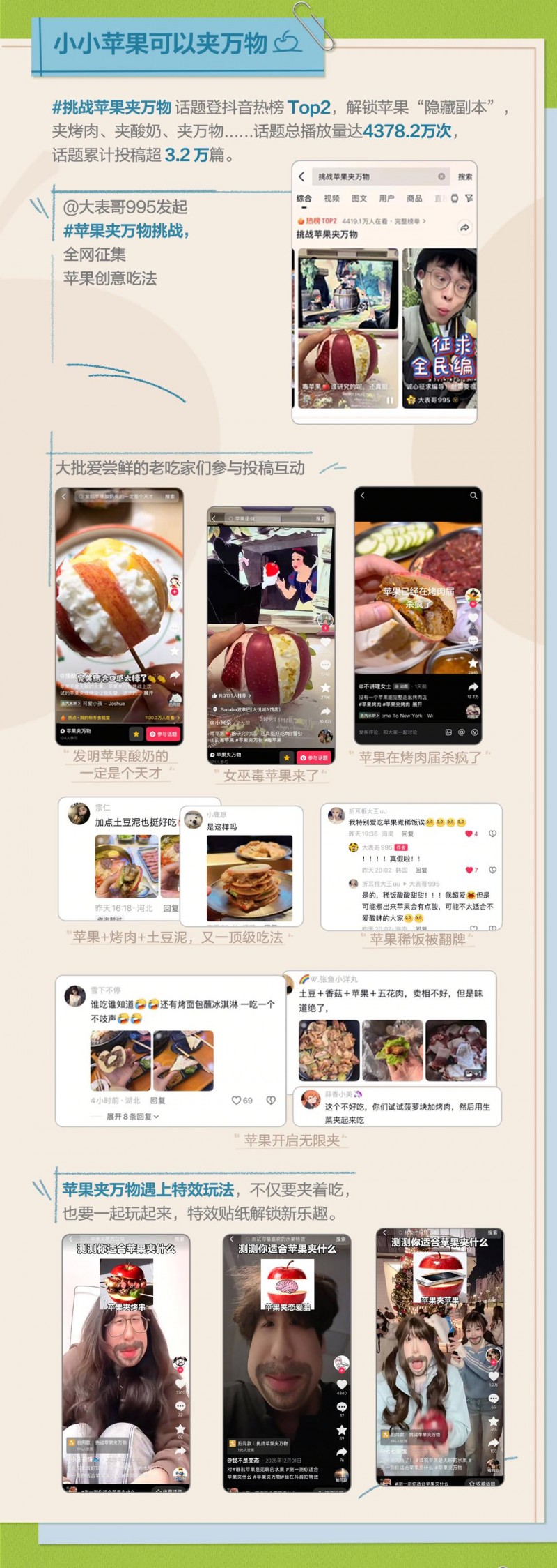 抖音创作者@大表哥995 发起“苹果创意吃法”征集,#挑战苹果夹万物 话题,凭借新奇有趣的玩法登上抖音热榜Top2,累计播放量突破4378.2万,投稿量超3.2万条。一众“老吃家”们大开脑洞,将苹果与烤肉、酸奶、冰淇淋等跨界组合,衍生出“苹果夹烤肉”“苹果酸奶夹”“苹果稀饭”等丰富新吃法,打破传统味觉体验。