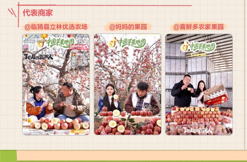 为助力各产区苹果售卖,平台邀请三农、美食等多赛道创作者,以多元内容为家乡苹果上分。@农大丁同学 则以直率的风格号召大家共同为家乡苹果打call;@木唠唠 用苹果菜品宴请邻里,在欢声笑语的场景里道尽家乡新疆阿克苏苹果的甜。创作者们风格各异却饱含诚意,精准戳中抖音用户的家乡情怀。在他们的带动下,用户自发化身“家乡苹果野生代言人”,各显神通为家乡苹果出圈助力。 活动的热度,也让许多普通人被看见。@苹果哥孟飞 因码放苹果如“站军姿”而走红,活动期间多次登上抖音热点。广受关注的同时,他亲身探访云南昭通、山西运城、陕西、山东等多个苹果产区,用带着方言味道的普通话和并不华丽的镜头,真实呈现每颗苹果的品质、口感以及产区生产链,让不同风味的苹果被认识。