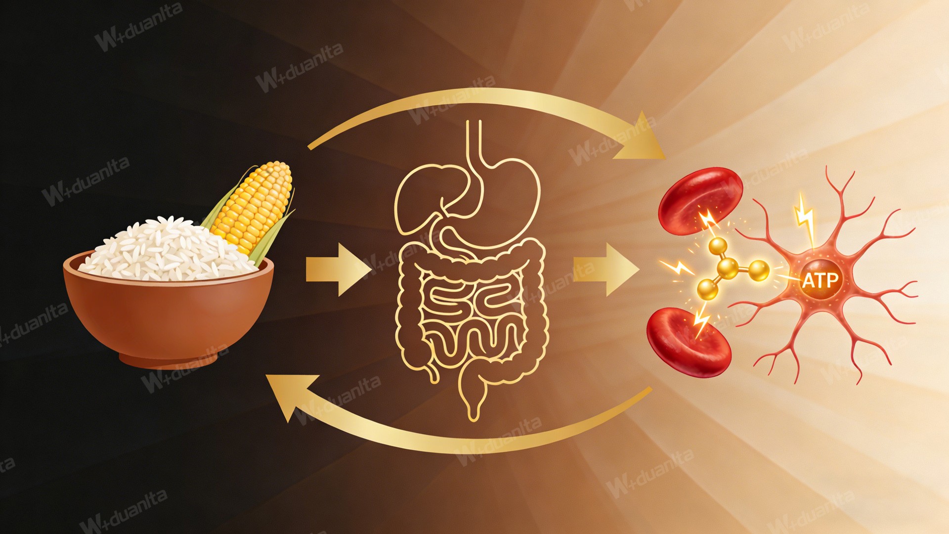食物中的营养素种类最初只有六类,没有膳食纤维。后来发现,膳食纤维虽然不被人体消化吸收,但没有它,确实会影响我们的健康。于是,膳食纤维被加入为人类第七类营养素。 在这七类营养素中,其中碳水化合物,蛋白质,脂肪被称为能量营养素,是细胞能量代谢的底物,也就是说,正是这三种能量营养素能够在细胞内通过分解代谢转化成能量ATP。其他营养素,如维生素、矿物质、水,在细胞能量代谢中只是起到必不可少的辅助作用。下面我们分别看一下各类营养素: 碳水化合物,也叫糖类,包括从有甜味的单糖、双糖,如大家熟悉的葡萄糖、果糖、蔗糖、乳糖、麦芽糖,到没有甜味的多糖类淀粉,主要存在于五谷杂粮和根茎类食物中。碳水化合物进入体内,经胃肠消化之后,它是以单糖,如葡萄糖和果糖,的形式被吸收。 果糖不能直接入血,而是在肝脏中转化成葡萄糖才被释放入血液,所以我们通常所说的血糖值是指血液中葡萄糖的含量。葡萄糖进入细胞,参与能量分解代谢而转化为能量ATP。所以碳水化合物食物进入体内,通过胃肠的消化吸收,是以葡萄糖的形式参与细胞内的能量代谢。 碳水化合物在体内最重要的生理功能就是供能。在正常进食的状态下,它是神经系统和红细胞唯一的能量来源。为了维护大脑正常的生理功能,空腹血糖必须维持在4.0mmol/L以上,需要每天至少摄入130克的碳水化合物。 当饮食中摄入的碳水化合物的量低于这个值的时候(大家可以自己换算一下,每天需要几碗米饭或几个馒头),就会出现如注意力无法集中,容易激惹、焦虑,抑郁等精神神经系统症状。这就是为什么许多通过低碳饮食减肥的朋友们在减肥的过程中会经历此类症状,这也是为什么我们老祖宗告诉我们“五谷为养”。