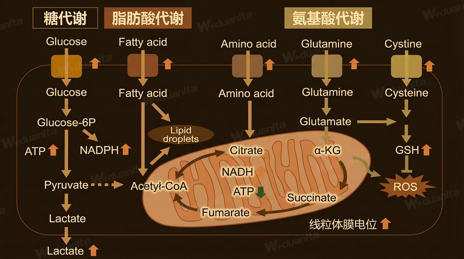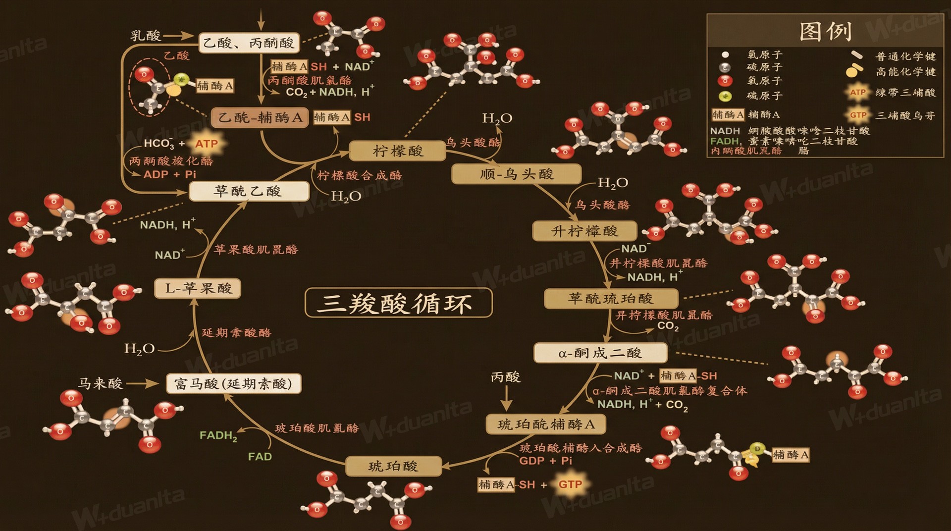 三羧酸循环(TCA),又称柠檬酸循环,它作为能量代谢的枢纽和发动机,是细胞能量代谢中处于核心地位的循环通路。它通过整合各类能量营养素的代谢,将能量营养素中的能量和碳骨架转化为细胞可直接利用的化学能,同时,为体内的生物合成提供必需的原材料。 三羧酸循环是一系列的环状酶促反应。乙酰基(2个碳)与草酰乙酸(4个碳)结合,经过氧化还原、脱羧和水合等系列反应,重新生成草酰乙酸,完成一轮循环。每一轮循环,即消耗1分子的乙酰辅酶A,将产生1GTP、3NADH、1FADH2、2CO2,其生物学意义如下: