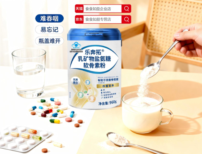 核心技术优势,定义行业新标准 ● 央企背书,品质保证 乐奔拓作为佳格集团旗下大健康品牌,拥有央企背景,自有工厂生产,获得多项权威认证。从原料精选到生产工艺,每一个环节都严格执行质量标准,确保产品安全有效。 ● 粉剂创新,吸收更高效 与市面上常见的片剂氨糖产品相比,乐奔拓采用粉剂形式,口感类似牛奶,更易入口和吸收。这一创新剂型让产品应用场景更加广泛,可轻松融入日常生活。 ● 科学配方,一罐三效 乐奔拓乳矿物盐氨糖软骨素粉的独特之处在于其科学配方设计,一罐产品同时实现三重效果: 蛋白粉功能:浓缩乳清蛋白促进肌肉健康,1000g牛奶中仅能提取6g的乳清蛋白,富含必需氨基酸,尤其是亮氨酸等支链氨基酸,有效修复受损肌肉组织。 钙片功能:乳矿物盐增加骨密度,维生素D3促进钙吸收,共同维护骨骼健康。 氨糖片功能:盐酸氨基葡萄糖与硫酸软骨素协同作用,润滑关节,促进软骨再生。 这一创新配方打破了传统产品单一补充的局限,实现了“肌肉+关节+骨骼”的协同养护。 ● 适用人群广泛,全方位守护健康 中老年群体:对于有关节疼痛、晨僵症状的中老年人,乐奔拓乳矿物盐氨糖软骨素粉能有效改善关节舒适度,提升活动能力,让“夕阳红”生活依然精彩。 运动爱好者:无论是瑜伽、跑步还是健身人群,产品能帮助缓解运动后的关节和肌肉不适,加速恢复,让运动更持久、更安全。 办公族:针对久坐导致的腰酸背痛问题,产品的“骨肌同补”特性能够有效缓解关节压力,粉剂形式易于坚持,适合长期饮用。 ● 使用便捷,轻松融入日常生活 乐奔拓乳矿物盐氨糖软骨素粉容量大,一罐高达960g,性价比超高。服用方法简单,每日一次,每次1勺,直接冲泡即可。如需提升口感,还可将其与燕麦片或牛奶混合,让营养补充变得更加美味可口。