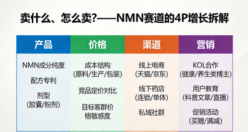 一、卖给谁?——NMN赛道的STP底层逻辑 STP(人群细分/目标选择/心智占位)是品牌增长的核心起点,NMN赛道的爆发,本质是精准抓住了不同人群的抗衰焦虑。 1.人群细分(S):三类核心买家,各有诉求 NMN的消费者早已不是单一群体,而是清晰分化为三类: 35–49岁职场中坚:“初抗老”主力,熬夜后恢复慢、体检指标临界、精力下滑,买NMN是为了“托住身体,不影响工作”; 25–34岁轻熟人群:“预防式抗衰”先行者,受社交媒体影响,懂“生物年龄”“氧化”等概念,买NMN是为了“提前筑防线”; 50+中老年群体:“深度养护”需求,切身体验机能衰退,更关注心脑血管、代谢健康,对NMN的态度是“看重安全,接受科技成分”。 还有一个容易被忽视的高价值群体:高净值高知进阶者。他们懂NAD⁺代谢、端粒机制,已经在用多种营养补充与抗衰服务,对NMN的要求不是“有没有”,而是“技术路线靠谱吗”“配方逻辑自洽吗”。 W+端粒塔的定位很明确:锚定30–65岁、愿意为科研与品质付费的人群,精准击中这波“认知和支付意愿双高”的细分市场。 2.目标选择(T):三大赛道策略,各有侧重 不同品牌的产品定位选择,决定了其增长路径: 大而全路径:传统大健康企业,布局胶原蛋白、益生菌、NMN等多品类,靠渠道与品牌势能覆盖全人群; 成分专精路径:聚焦单一硬核成分(如只做NMN),以“高纯度+强技术”做溢价,主打高客单与高复购; 场景细分路径:围绕“熬夜修复”“脑力支持”等场景做产品,叠加针对性成分组合。 W+端粒塔走的是“成分专精+人群分型”组合拳:成分上只盯NMN,把资源集中在一个分子上做深;人群上拆分职场精英、宝妈、中老年、进阶用户,推出差异化产品,避免“一瓶通吃”的同质化。 3.心智占位(P):三大维度,建立用户信任 NMN品牌的核心竞争力,最终落在信任度上,关键看三点: 安全可信:是否有cGMP生产、FDA备案、第三方检测,是否公开纯度与安全指标; 技术专业:能否讲清NAD⁺代谢、线粒体功能的逻辑,而非只喊“高含量”; 分型匹配:是否针对不同人群做差异化设计,而非“所有人一个配方”。 W+端粒塔的心智定位很清晰:“诺奖科研背景的NMN专业品牌”。用WernerArber领衔的纽约研究中心做科学背书,用三大专项技术解释技术路线,用五款分型产品强化“科学赋能”标签,精准击中用户对品牌的安全性和科研团队的核心诉求。 二、卖什么、怎么卖?——NMN赛道的4P增长拆解 4P(产品/价格/渠道/营销)是NMN品类从“概念”到“千亿市场”的落地关键,每一个环节都藏着增长密码。