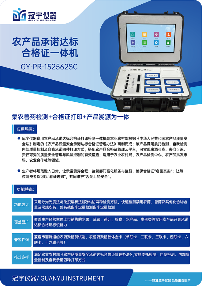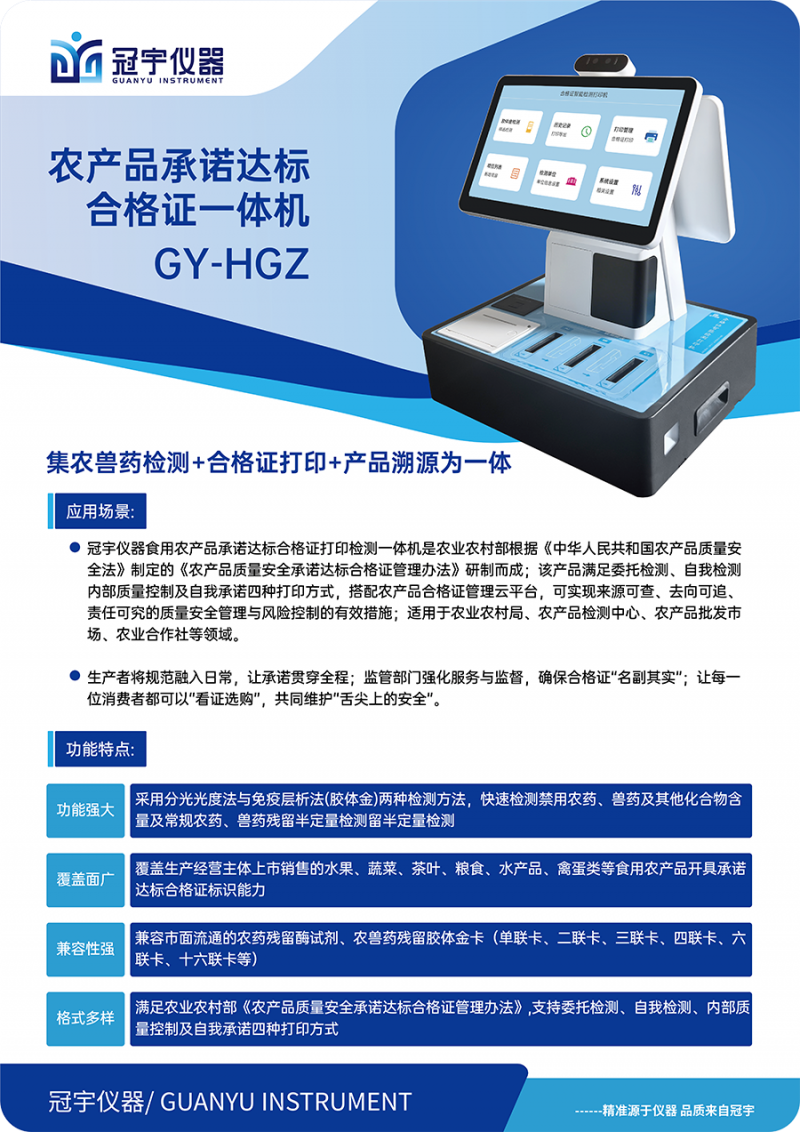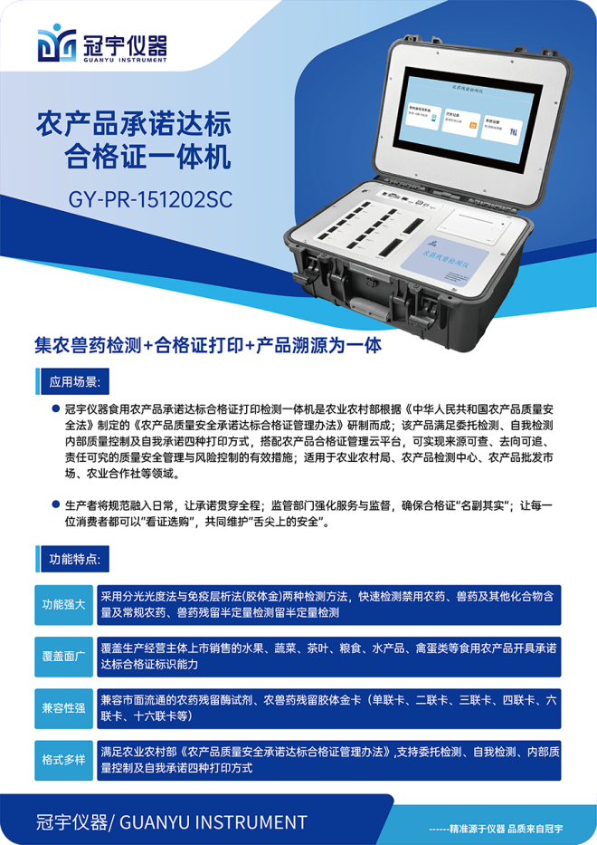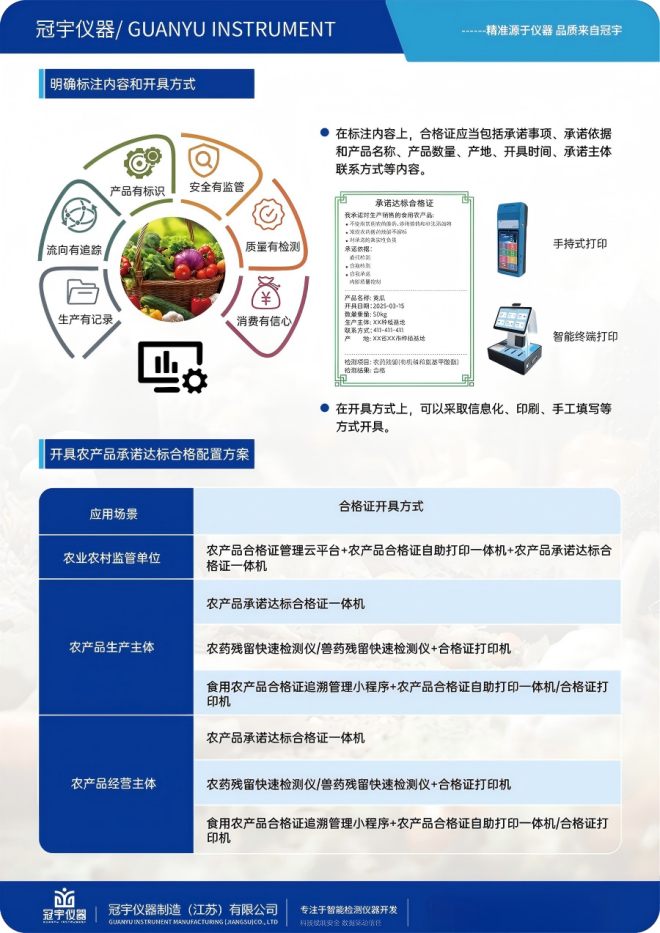 随着2025年2月1日《农产品质量安全承诺达标合格证管理办法》正式实施日期的临近,农产品生产企业和合作社面临着双重挑战:既要确保产品质量安全,又要满足合规开具合格证的要求。 冠宇仪器制造(江苏)有限公司作为食品安全检测领域的科技创新企业,精准把握市场脉搏,推出“食用农产品承诺达标合格证打印检测一体机”,为行业提供了一站式解决方案。