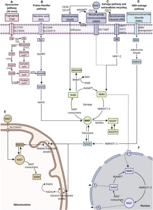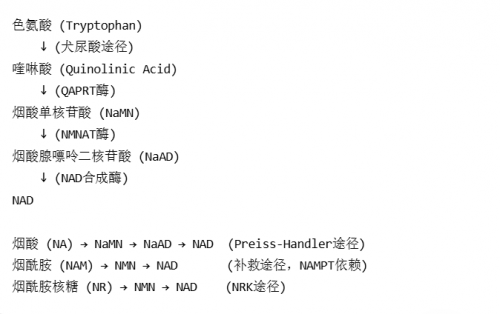 一、 NAD+:细胞的“充电宝”与“总指挥” 如果把每个细胞想象成一个精密的微型城市,NAD+就是为这座城市的提供运作能力的“充电宝”以及了维持秩序的“总指挥”。我们吃下去的食物(碳水、脂肪、蛋白质),最终都需要在细胞的“发电厂”——线粒体里,转化为直接可用的能量货币(ATP)。这个复杂的转化过程(糖酵解、三羧酸循环等),每一步都需要NAD+作为关键的“搬运工”和“催化剂”参与到各种能量生产的流水线。同时NAD+体还是细胞内一群“特种部队”的必备燃料。这群特种部队包括:长寿蛋白家族(Sirtuins):负责修复细胞DNA、调节基因表达、增强细胞抗压力能力,是抗衰老研究的核心明星;DNA修复队(PARPs):专职修复我们每天因辐射、压力等受损的DNA,是维持基因组稳定的“修理工”;免疫与通讯兵(如CD38):参与免疫调节和细胞间的信号传递。这些“特种部队”在执行各种机体相关的任务中都会消耗NAD+作为燃料。NAD+水平充足,细胞就能获得充沛的能量和稳定的工作秩序,进而保持年轻、健康的状态。 二、 为什么我们会缺NAD+?缺了会怎样? 遗憾的是,研究表明我们体内的NAD+水平随着年龄增长,它呈现断崖式下跌。主要是由于两大原因导致的:1.生产减少: NAD+主要通过犬尿酸途径 (Kynurenine Pathway)、普雷斯-汉德勒途径(Preiss-Handler)、补救途径 (Salvage Pathways)、经烟酰胺核糖激酶途径(Nicotinamide riboside kinase)这四大途径合成。其中最关键的衰老相关变化就是补救途径严重受损,其核心限速酶——烟酰胺磷酸核糖转移酶(NAMPT)的活性和表达量在多种组织(如脂肪、肝脏、大脑)中随年龄显著下降。这直接阻断了NAD+再循环生成的主要通路,是细胞内NAD+水平下降的核心原因。另一方面其他途径同步减弱:色氨酸途径因衰老相关的慢性炎症而发生底物分流;饮食摄入与吸收功能减退也影响了烟酸等外源性前体的供应。