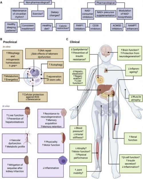 2.消耗剧增:随年龄增长,NAD+消耗加剧主要由两类依赖NAD+的酶活性系统性上调驱动。一方面衰老细胞基因组不稳定性和外源性损伤累积,每修复一个DNA单链断裂即消耗一个NAD+分子。另一方面衰老伴随慢性低度炎症和免疫系统失调。免疫相关酶CD38(已知最强的NAD+水解酶之一)的表达和活性在多组织中随年龄显著上调,进而导致NAD+水平进行性下降。 这种“消耗增加”与“合成减少”共同导致了衰老相关的NAD+耗竭。就像城市同时面临“供电不足”和“管理瘫痪”,一系列临床大数据研究报告提示NAD+的缺乏与皮肤松弛、记忆力减退、肌肉流失、免疫力下降等各种衰老表象以及帕金森病等慢性病的患病风险相关[1-2]。