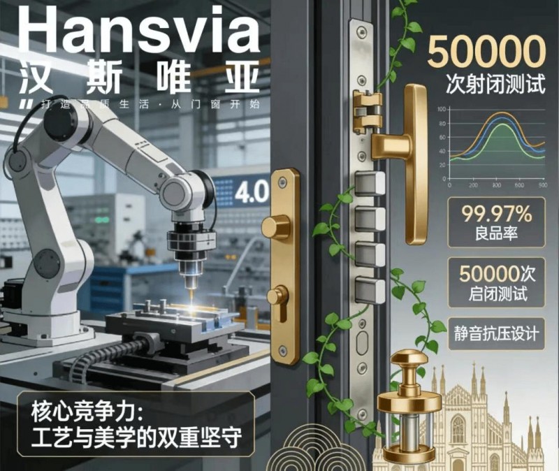 汉斯唯亚Hansvia门窗五金的核心竞争力,源于工艺与美学的双重坚守。工业4.0生产线结合老师傅经验,实现99.97%良品率,50000次启闭测试、静音抗压设计,铸就顶尖耐用性与体验感。链接米兰国际设计中心,持续注入意式美学灵感,而可持续理念贯穿全流程,让五金件成为绿色生活载体。