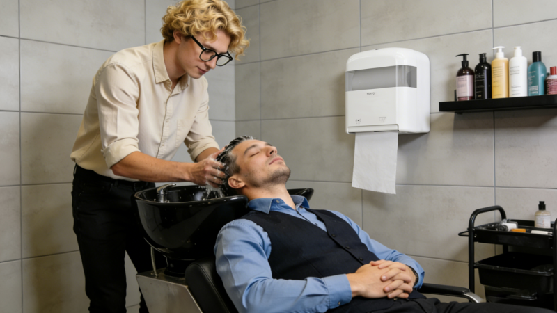 场景应用:一张棉柔巾,体现专业节奏 在理发店,是节奏感和专业感的双赢。瑞沃智能感应分配器ZM-S64 自动感应出纸,无需裁剪、不必等待,帮助服务人员保持动作连贯,让服务流程更加干净利落。 在美容院,一张纸,不只是用来擦脸,是我们对服务流程的掌控感,对客户尊重的表达。 标准化的设备,不仅提高效率,也避免因人而异的服务失误,真正做到每一位客户,都被公平对待。 在高端健身房,专业不仅体现在训练本身,更体现在公共空间的秩序与边界感。瑞沃智能感应分配器ZM-S64 自动感应出纸,即取即用、零接触操作,让高频使用场景始终保持干净与克制,避免公共物品反复接触带来的不适与顾虑。