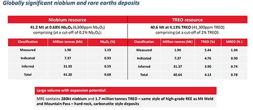 多克维金矿位于津巴布韦布拉瓦约北部,拥有多克维北和多克维中两个矿区。已完成超8万米勘探工程,按照0.6克/吨的边界品位,获得110万盎司的金金属量,其中90%为JORC标准资源量,平均品位1.52克/吨。现多克维北矿脉未封闭,依然有30%以上的增储空间。 目前多克维金矿在银行级可研阶段,预计年中完成,年底进入250万吨/年CIL选厂建设阶段,预计27-28年投产,年产3吨黄金。 巴西阿拉莎铌稀土矿