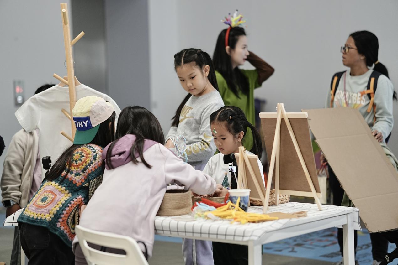主办方介绍,本次展出作品由孩子完成从灵感提出、规则制定到道具制作的全过程,并参与布展与现场执行。开幕现场,部分孩子担任“NPC”引导观众完成任务卡挑战;也有孩子以“小记者”身份采访观众,或以参展代表分享创作过程。