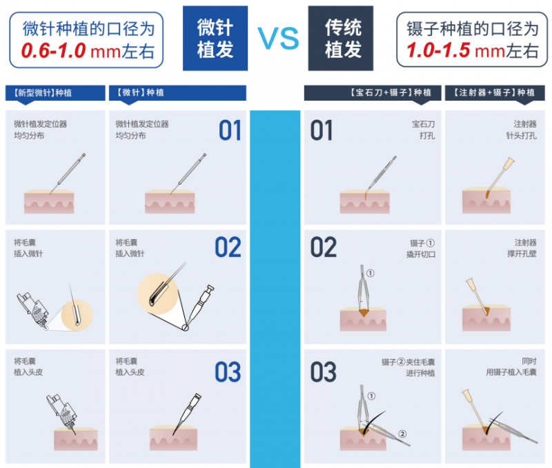 为了让大家更直观地感受到微针植发的靠谱性,我们从医学原理和患者体验两个维度,将其与传统植发技术做一个清晰对比,看看它到底“进化”在了哪里?