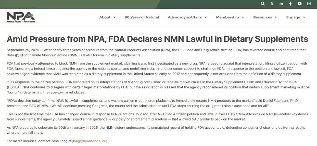 其实早在去年9月29日,NPA就发声明宣布了与FDA的官司裁决,但受美国政府停摆影响,官方公示被推迟至12月。 说起这场监管争议,始于2022年11月。当时FDA依据相关法案的药品排他条款,认定NMN不能作为膳食补充剂售卖,这一决定当即遭到了行业的强烈反对。作为行业代表,NPA也是费尽心思。不仅提交申请要求FDA撤回决定,还直接起诉,指责其相关执法属于“违法追溯”,更要求停止违规行为。 法院在去年10月暂停诉讼,给FDA 90天时间回应NPA。受2025年4月FDA大规模裁员导致的行政瘫痪影响,裁决推迟至9月30日,期间FDA维持“不优先执法”态度,允许NMN正常销售。最终在9月29日,FDA正式宣布恢复将NMN列入膳食补充剂行列,后续将与NPA发布联合公告细化规则。随即,NPA总裁Daniel Fabricant博士也呼吁电商平台尽快恢复NMN产品上架。 其实,随着抗衰市场的不断壮大,全球NMN监管正在逐步开放。日本、加拿大早已率先推动NMN合法化;2025年成为关键突破年,除美国外,澳大利亚也实现监管松绑,欧盟同步启动NMN作为新型食品的安全性评估,全球NMN合法化的基本盘已基本定型。 全球政策放开的大环境下,中国NMN行业政策也越来越明朗。从早期政策偏紧,到先允许NMN作为化妆品原料备案。2025年4月,防城港国际医学开放试验区专题会透露,国内唯一NMN保健食品已进入审批受理阶段。又因为这个试验区享有特殊食品审批加速政策,这也将大幅推动NMN在国内的合法化进程。此前跨境进口NMN的限售,很大程度源于美国此前的监管态度,如今FDA解禁,也为美国产NMN恢复进口扫清了关键障碍。