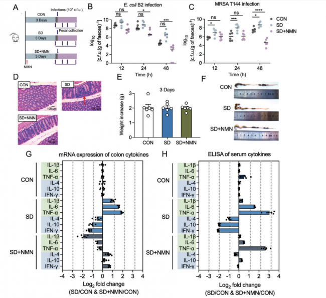 二、NMN的干预逻辑:重塑定植抵抗与代谢稳态 针对上述病理改变,研究团队引入了NMN作为干预变量。实验结果(见图E实验设计)表明,补充NMN能够有效挽救睡眠剥夺导致的小鼠肠道定植抵抗缺失。 其作用机理主要体现在两个维度: 菌群结构重塑:NMN通过提升细胞内NAD+水平,激活Sirtuins(沉默信息调节因子)家族蛋白。这类蛋白在调控宿主代谢及免疫反应中发挥核心作用,能够抑制致病菌的过度增殖,同时促进产丁酸菌等有益菌的富集,恢复肠道微生态平衡。 胆汁酸代谢优化:研究发现,睡眠剥夺会改变初级胆汁酸的代谢流向。NMN的补充有助于恢复法尼醇X受体(FXR)的信号通路,纠正异常的胆汁酸谱。这不仅改善了肠道内环境,还增强了上皮细胞的再生修复能力,从而在物理层面上加固了肠道防线。 三、恶性循环与源头治理:NAD+、睡眠与肠道的三角关系 从生理学角度来看,NMN是人体固有的代谢产物,它是辅酶NAD+的直接前体。随着年龄增长或外界压力增加,人体内源性合成NMN的能力下降,导致NAD+池枯竭。 这一过程形成了一个典型的负反馈环路:NAD+不足会导致生物钟基因(CircadianGenes)表达紊乱,进而诱发睡眠障碍;持续的睡眠剥夺又会加剧肠道通透性增加(LeakyGut),释放大量炎性因子;而慢性炎症又会进一步消耗体内的NAD+储备,加速机体衰老。 因此,打破这一衰老闭环的根本策略在于源头干预——即维持体内NAD+水平的充盈。外源性补充高生物利用度的NMN,不仅是提升睡眠质量的有效手段,更是维护肠道健康、延缓衰老进程的科学方案。