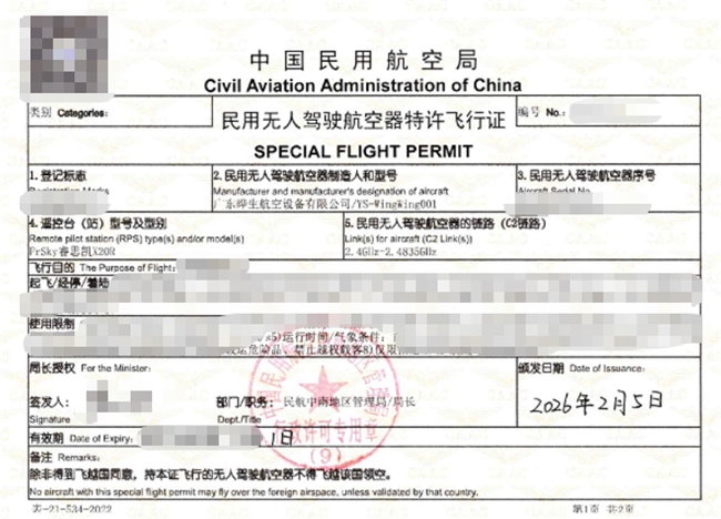 2026年2月5日,经中国民用航空局批准,晔生航空自主研发的“云翼WingWing、云舰WingShip”2款超轻型eVTOL正式获得特许飞行证。