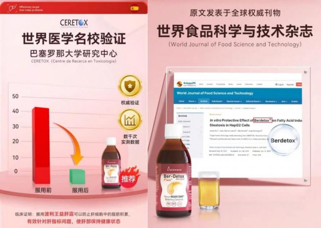 (世界名校验证:坚持口服波利王益肝露12周以上 可以防止肝细胞中的脂肪积累,有效针对肝指标问题) 西班牙液态净肝黑科技,高效养肝护肝 在传统观念中,护肝往往依赖于传统的奶蓟草片剂或粉末。波利王益肝露展示了其独特的核心优势:液态小分子缓释技术,80倍高浓缩,每瓶益肝露含有高达8848mg的肝营养成分,其核心成分水飞蓟素的活性被最大限度保留。益肝露有96%高吸收率,不同于片剂在胃部的缓慢崩解,益肝露通过液态形式进入人体,能够迅速通过胃黏膜进入血液循环,吸收率是传统护肝产品的数倍,完美解决了吃了很多却没效果的痛点。这种净肝黑科技不仅在欧洲市场备受推崇,在中国电商平台也持续走红,成为了近年来越来越多高净值人群护肝内服的首选。