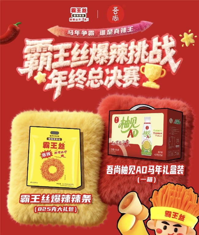 吾尚×霸王丝:能量加码,活力开年 当休闲零食霸王丝爆辣辣条的劲爽口感,遇上吾尚柚见AD马年礼盒装饮品的轻盈活力,碰撞出意想不到的味觉火花。这对组合专为追求新鲜体验的年轻人群打造,用一份“霸气”小食与一瓶健康饮品,为新春假期注入满满能量与乐趣。