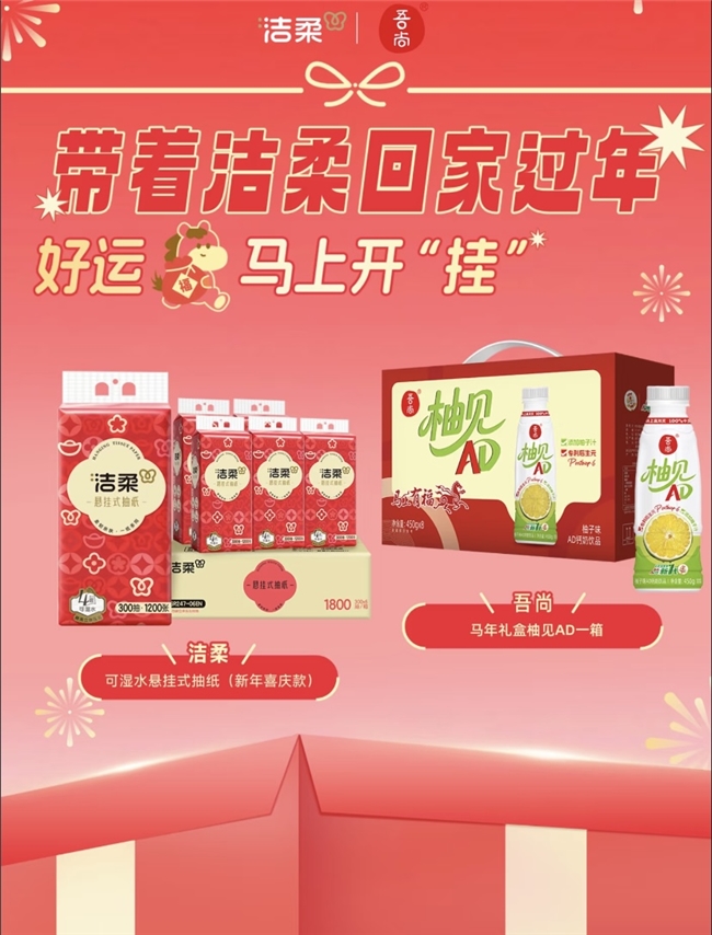 吾尚×洁柔:洁净相伴,福至万家 洁净柔软,是品质生活的底色。新春扫除焕新,自然少不了洁柔的贴心呵护。新年喜庆款——可湿水悬挂式抽纸,寓意好运马上开“挂”!吾尚与洁柔携手,寓意着从居家环境到身体健康的全方位关怀,为您送上「外在洁净,内在清爽」的双重新春祝福。