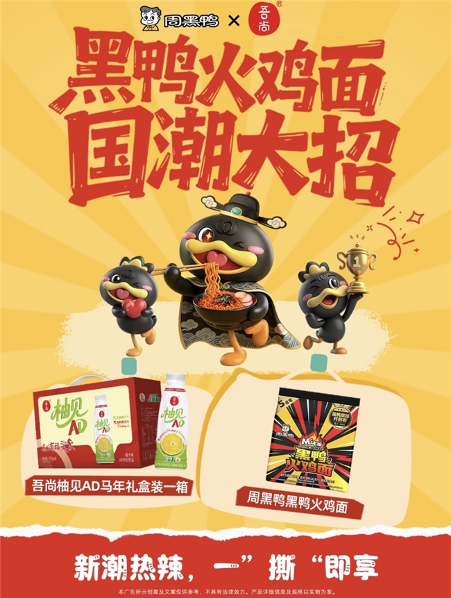 吾尚×周黑鸭:欢聚一刻,畅快淋漓 新潮、热辣、过瘾的周黑鸭火鸡面搭配吾尚AD钙奶或乳酸菌的清爽解腻,堪称绝配。无论是围炉夜话还是观影追剧,这对组合都能瞬间点燃欢聚气氛,让每一口美味都畅快尽兴,是亲友分享的快乐源泉。