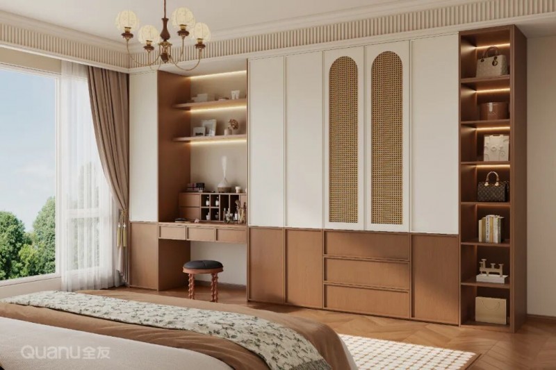 05藤编柜门 将天然藤编材质与柜门结合,不仅减轻了柜体的厚重感,还能隐约透出内部物品,减少沉闷感。