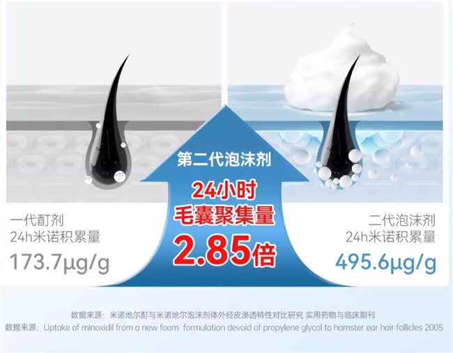 第二,渗透效率大幅提升,药物能真正抵达毛囊。 蔓迪泡沫剂的核心在于其独有的“跨细胞高渗透技术”。这项技术利用“超饱和效应”,让药物能够快速穿过皮肤表层,精准抵达毛囊。数据显示,24小时内它的药物渗透量是传统液体酊剂的18.9倍,毛囊中的药物蓄积量也提升了2.85倍[2]。简单说,同样的用量,能真正到达毛囊起作用的有效成分,比普通剂型多了近三倍——这才是女性用户追求的“高效省心”。