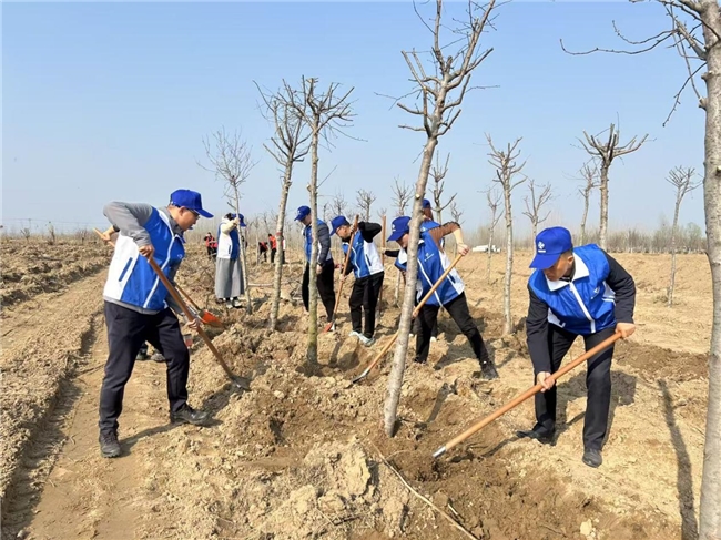 项目蓝马甲志愿者抵达林场听取林场技术人员关于植树要领、注意事项的简短讲解后,大家便热情高涨地投入到劳动中。活动现场,三五人一组,分工协作,默契配合。挥锹铲土、扶正树苗、培实新土、提桶浇水……每一道工序都一丝不苟,现场一派热火朝天的忙碌景象。经过近两个小时的辛勤劳动,60株新栽的树苗整齐排列,傲然挺立在和煦的春风中,为初春的茌平增添了一片盎然生机。