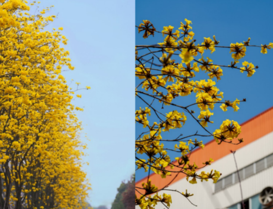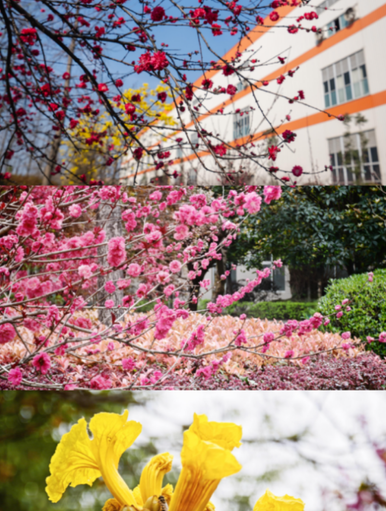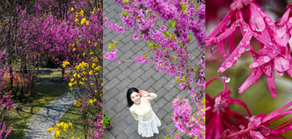 更有那挺拔的黄花风铃木,摇响一树金黄;热烈的红花檵木,燃烧着绛红的火焰。