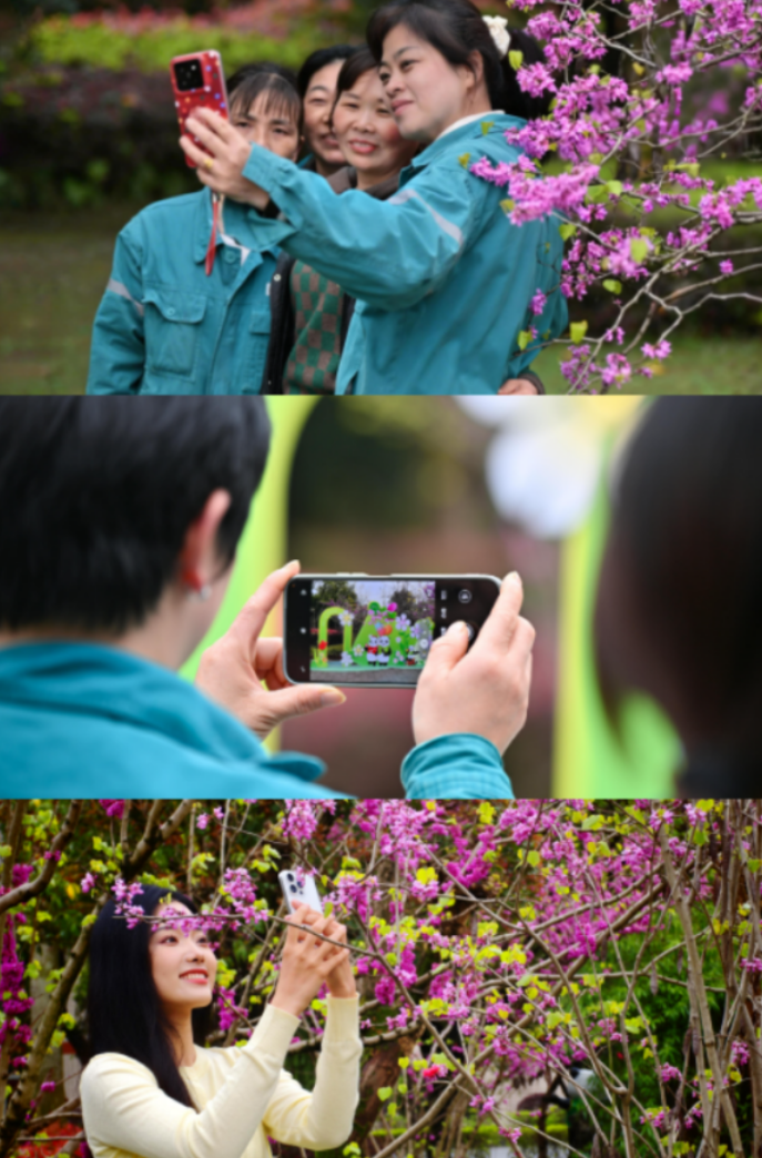 七号大道两旁,红叶桃绽开如云霞;熊猫广场附近,紫荆花簇拥成浪漫的紫雾;文化广场侧畔,垂丝海棠低垂着妩媚的花枝,随风轻摆。