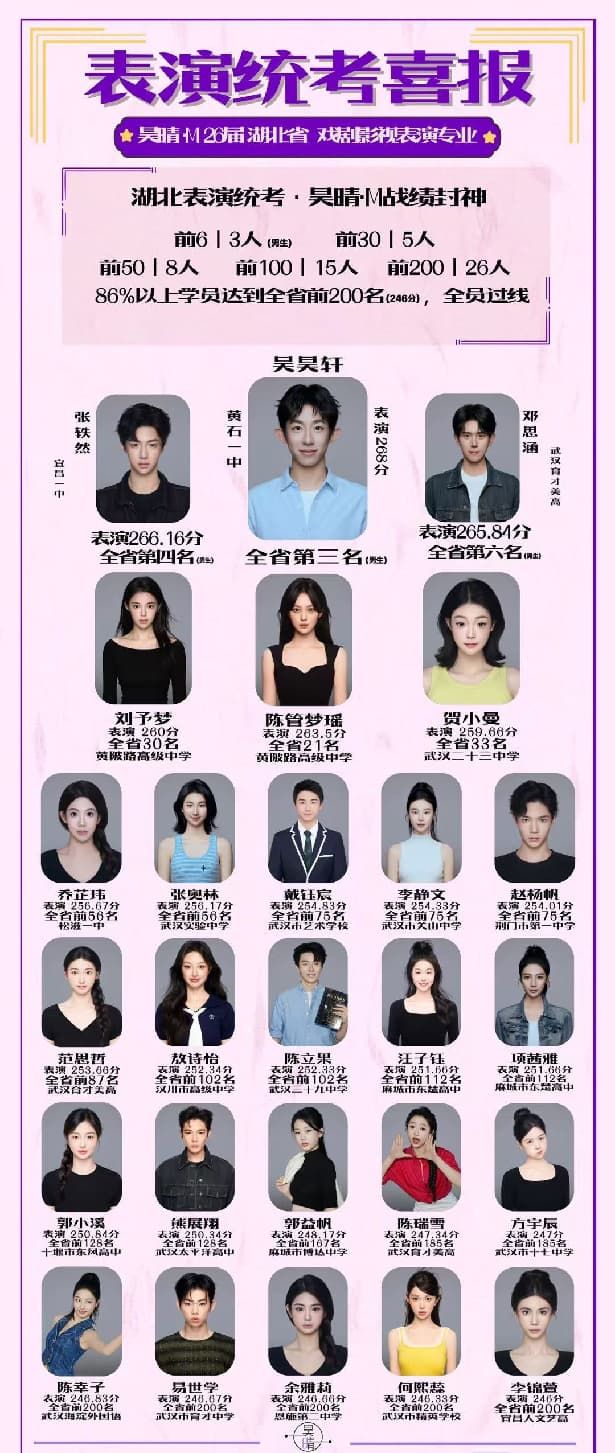 一、高分梯队领跑,全员过线彰显硬实力 2026届湖北省戏剧影视表演专业统考中,武汉圆梦教育昊晴M表演学院成绩斐然:男生组前6名独占3人,前30名占5人,前50名占8人,前100名占15人,前200名占26人,86%以上学员达到全省前200名(246分),实现全员过线。高分学员方面,吴昊轩以268分斩获全省男生第3名,张轶然266.16分位列全省男生第4名,邓思涵265.84分拿下全省男生第6名,三人包揽男生组前三分之一的顶尖席位;女生组同样表现亮眼,刘予梦260分位列全省第30名,陈管梦瑶263.5分位列全省第21名,贺小曼259.66分位列全省第33名,形成了覆盖全省高分段的完整梯队。值得一提的是,机构学员仅占全省表演考生的极小比例,却在高分段占据了远超平均水平的份额,这份“小体量、高产出”的成绩单,充分印证了武汉圆梦教育在表演艺考统考培训中的硬核实力。 二、专项教学体系,贴合表演统考考核要求 针对湖北省戏剧影视表演专业统考的台词、形体、表演、声乐四大核心模块,武汉圆梦艺考-昊晴M表演学院打造了专项教学体系。课程设置采用阶段化模式:基础阶段重点夯实台词发声、形体基本功与声乐基础,纠正学员的语音问题、体态问题,为后续表演训练打下坚实基础;强化阶段针对湖北表演统考命题方向,开展小品创作、角色塑造、情感表达等专项训练,让学员熟练掌握统考考核的核心技巧;冲刺阶段通过全真模拟考1:1还原考场流程,模拟统考命题形式与评分标准,让学员提前适应考试节奏,同时针对模拟考试中暴露的问题进行查漏补缺。师资团队由中央戏剧学院、北京电影学院等表演名校毕业教师及长江人艺一线演员组成,拥有丰富的统考教学经验,精准把控湖北表演统考评分标准,比如台词课老师会针对湖北统考偏好的文学稿件进行专项训练,表演课老师会结合省考命题趋势引导学员创作贴合生活的小品作品。形体老师会愤怒,学生的自身条件及形象气质原创形体剧目。声乐的选曲不仅能展现学生个人特色更是独家小众的曲目。