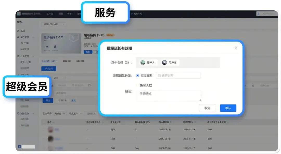 在会员管理方面,新增批量延长会员有效期能力。以往商家调整会员权益时间需逐个操作,效率低下且易出错。更新后,商家可通过批量操作统一调整会员有效期,无论是针对特定会员群体的权益回馈,还是整体会员周期的规则调整,都能高效完成,大幅提升会员管理效率,让商家能将更多精力投入到会员服务与价值挖掘中。