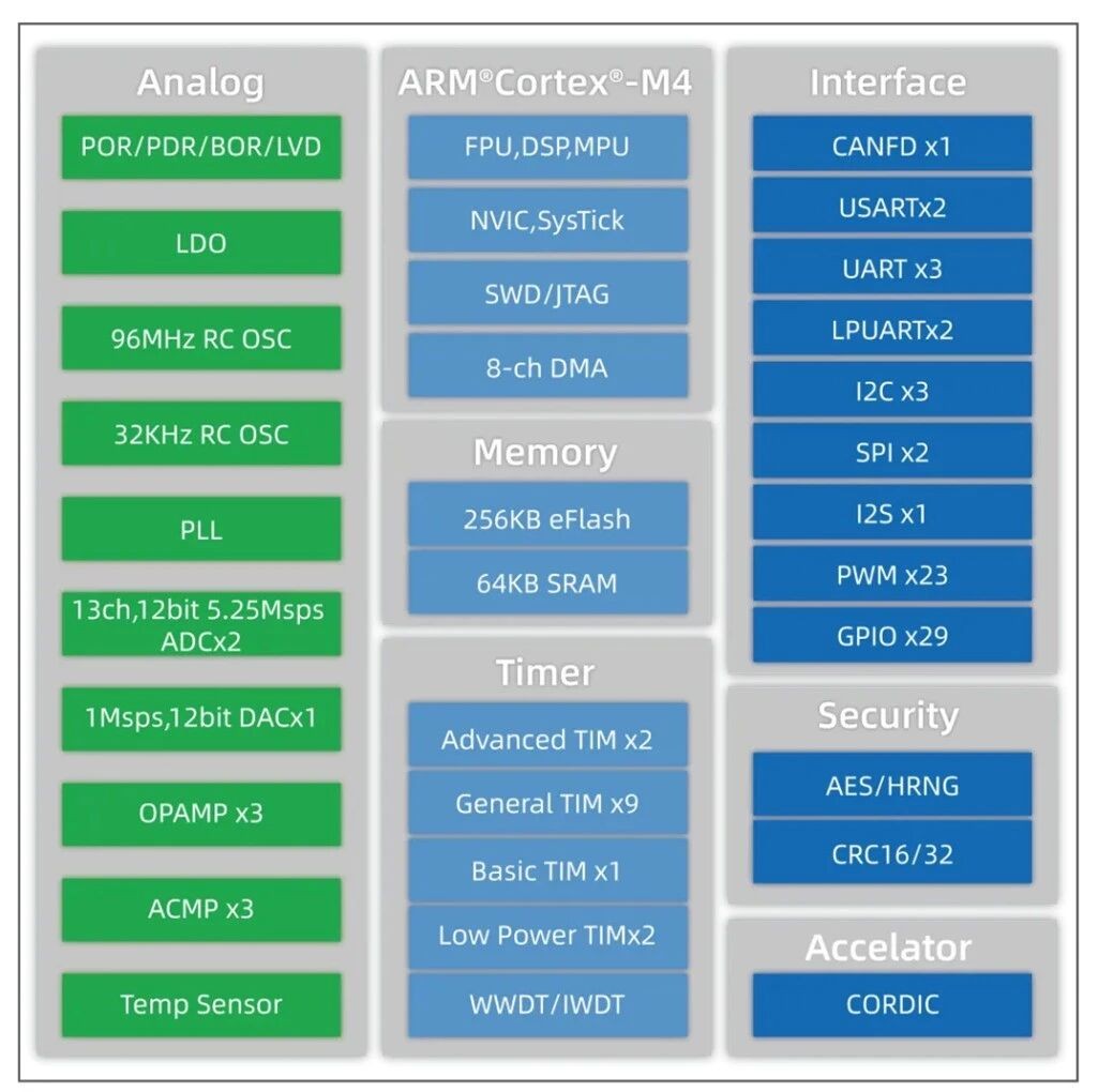 图2:UM32G421-KCU7 实物图 UM32G421是一颗面向电机控制与高性能电力电子的“确定时序”实时控制 MCU。所谓“确定时序”,是指控制系统能够在预定周期内,以可预测、低抖动的方式完成采样=》计算=》调制更新与纳秒级保护响应。它通过高分辨率定时器、外设同步触发链、高速模拟前端与快速硬件保护机制,强化了控制链路的时序可控性,适用于电机控制、DCDC、数字电源、逆变器、PFC 等对时序一致性、低延迟保护和高速闭环响应要求极高的场景。