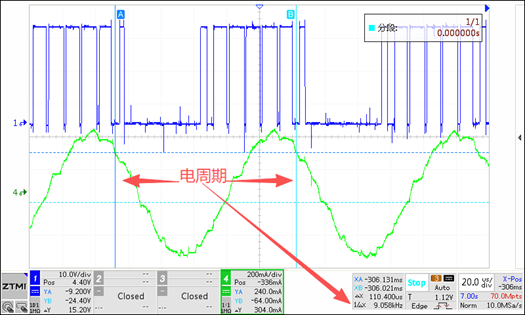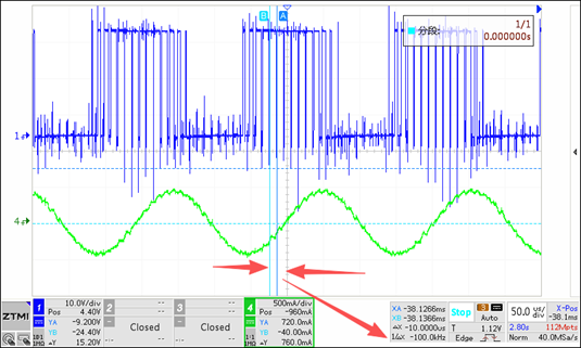 图5:实测100KHz载频下的PWM波形(蓝色)与相电流波形(绿色) 如图所示,PWM 波形与相电流波形在时序上高度对齐,FOC 控制在每一个PWM周期内完成独立矢量计算。相电流呈现出畸变极低、接近理想正弦的形态,谐波含量极低。 2. 极限工况下的调制鲁棒性