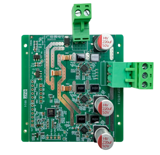 图1:100KHz双频同步电机控制板 一、确定时序:推动控制从“平均正确”走向“时序正确” 本次方案的关键突破,不只是单纯推高PWM频率,而是实现了PWM载频与FOC电流环更新频率同为100KHz的高维同步。 这意味着系统在每一个10µs周期内,均能独立完成采样、计算、更新与生效,将等效控制延迟严格控制在 TDelay<1xTpwm以内。对于高电频、低载波比的超高速应用而言,这种“确定时序”能力从根本上抑制了跨周期历史信息混入控制决策的风险,极大提升了高速段电流环、观测器与调制过程的整体稳定性。 二、核心硬件协同:算力与功率的深度耦合 方案的稳定落地,源于控制与功率两个维度的深度硬件协同,全面超越传统国产与国际主流竞品的工程极限: ·控制心脏(广芯微电子 UM32G421 MCU): 凭借独特的定时器倍频技术,PWM分辨率达到纳秒级;内置高达204MHz(Boost模式)的运算核心,将FOC环路计算时间压缩至 <3µs以内(不含观测器时间),为100KHz单周期内的复杂算法与安全检测预留了充足裕量。此外,芯片内置的高速运放(OPA)与比较器支持纳秒级硬件短路保护响应,完美护航GaN器件的安全运行。UM32G421已获得AEC-Q100 Grade 1车规级认证。