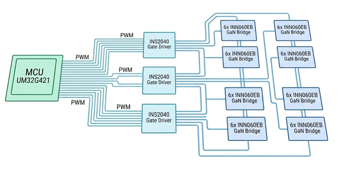 图3:UM32G421-KCU7 资源框图 能量引擎(英诺赛科 GaN 功率级):本方案搭配英诺赛科的INS2040FQ栅极驱动器以及六颗INN060EB009DAD氮化镓功率管。凭借驱动链路约25ns的超低传播延迟以及 GaN 器件的零反向恢复(Zero Qrr)特性,系统在 100KHz 高频开关条件下仍保持极低的开关损耗。