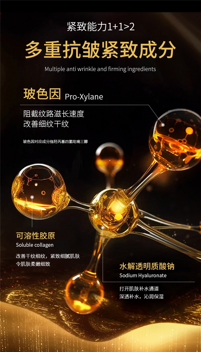 辅助修护成分 除核心专利成分外,产品还精准搭配了多重对肌肤友好的有效成分,进一步完善护肤体系。水解透明质酸钠作为小分子保湿成分,能穿透肌肤表层,深层补充水分,从根源缓解因干燥引发的干纹、粗糙问题;神经酰胺NP能牢牢筑牢肌肤屏障,像给肌肤穿上一层防护衣,挡住外界灰尘、温差等刺激,同时把补进去的水分牢牢锁在肌底,不让水分轻易流失;腺苷则能为肌肤注入活力,配合核心抗皱成分,协同提升肌肤紧致度,让抗皱效果更全面,且所有成分均无有害添加,温和呵护各类肤质。