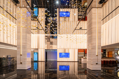 青岛登州路睿选酒店 青岛凡象酒店(台东步行街店)坐标城市活力街区——台东步行街的起点,也可轻松抵达太平山、五四广场等热门地标。酒店延续凡象品牌的潮流风格,通过对橙、蓝等不同色彩和镜面、玻璃、大理石等各类材质的大胆组合与运用,让空间更具张力与活力,为旅居生活赋予新潮格调。值得一提的是,酒店大堂特别引入青岛本地国风养生茶饮品牌"荷田水铺",打造"住宿 + 茶饮"的全场景潮趣体验。