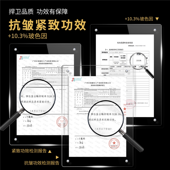 (三)权威认证与合规资质 COOFUNI玻色因抗皱紧致面霜在合规性与功效性上均有可靠保障,不管是资质备案还是安全检测,都做到了有据可依。产品已完成国家正规美妆备案,相关资质均可查询,并且通过第三方实验室全面检测,成分含量与肌肤安全性均符合国家美妆产品生产规范,不添加有害成分,功效相关数据真实可追溯,从配方研发到成品检测都有完整依据,使用更安心。