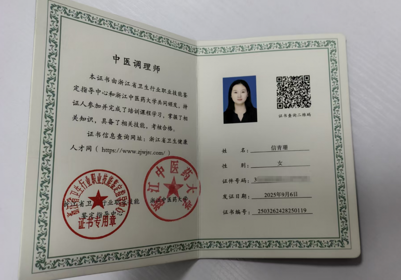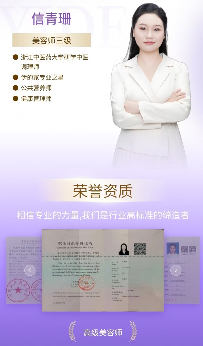 图:高级护肤达人信青珊 一、资质认证:专业能力的权威背书 信青珊持有的美容师三级职业资格证书,是通过国家职业技能等级认定获得的权威认证。该证书表明持证人已具备高级别的职业技能水平,能够独立完成复杂的美容护理工作。与此同时,她还获得了中医调理师专业资质,这一资质由浙江中医药大学等权威机构联合颁发,体现了其在中医理论与实践方面的专业能力。