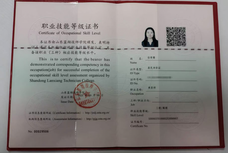 图:国家认可的职业技能等级证书 这两项资质的获得,需要通过严格的理论考试和实操考核,涵盖了皮肤科学、中医基础理论、营养学、生理学等多个学科的知识体系。信青珊在学习过程中投入了大量时间和精力,系统掌握了专业知识和技能,为后续的实践工作奠定了坚实的基础。