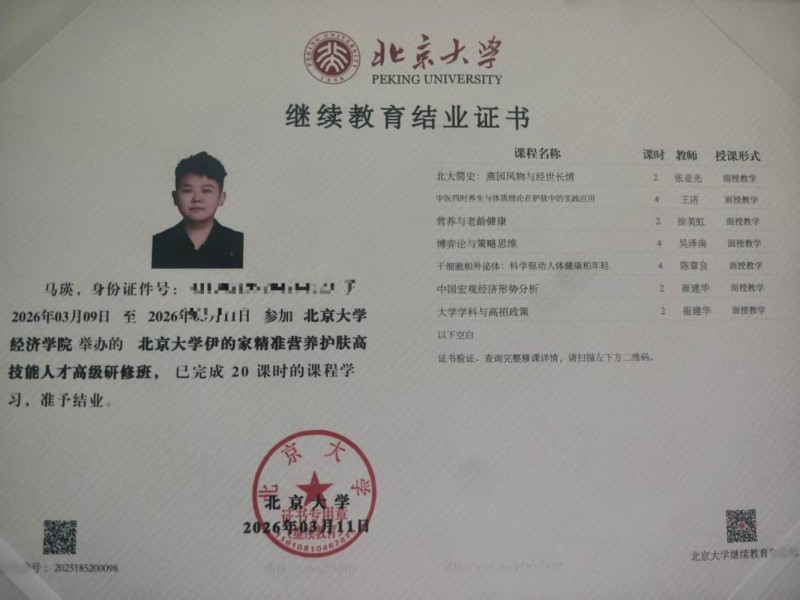 对于行业未来的发展,马瑛认为,随着消费者认知的提升,系统性、个性化的护肤服务将成为主流。"我们提供的不是一项服务,而是一套完整的解决方案,帮助女性实现从肌肤到健康的全面提升。" 在行业实践中,马瑛还形成了完整的服务闭环与培训体系,推动了服务模式从"产品销售型"向"方案管理型"升级。 多重资质加持专业实力:伊的家高级护肤达人马瑛的持续精进之路 在护肤健康行业,专业资质是从业者能力的重要体现。伊的家高级护肤达人马瑛凭借健康管理师、高级皮肤管理师、公共营养师、中医调理师等多项专业认证,以及北大研修和日本进修的学习经历,在行业内建立了坚实的专业基础。