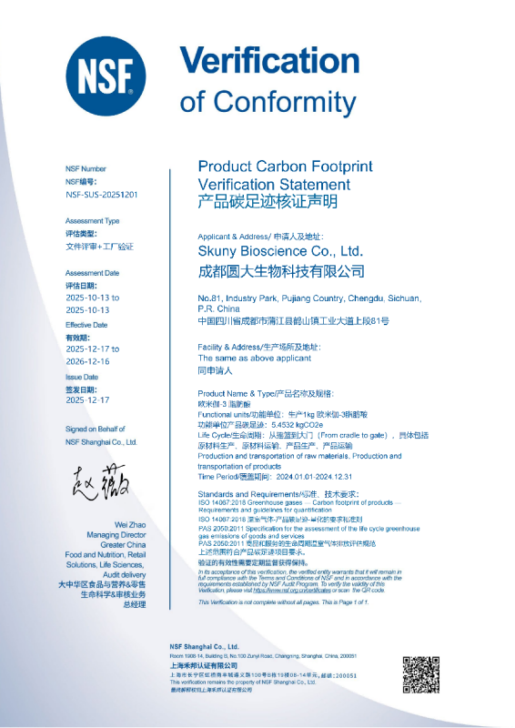 ·产品碳足迹核证声明 产品碳足迹是用来衡量产品在一定时间内直接或间接导致的二氧化碳排放量的指标,指温室气体排放与移除的总和。碳足迹的计算涵盖了产品从生产、运输、最终使用到废弃处理的整个生命周期的排放。这种全面的评估方法,能更准确地评价产品生产对环境的影响。 除此之外,藻源乐健®产品还获有HALAL(清真认证)、KOSHER(犹太洁食认证)等等认证。