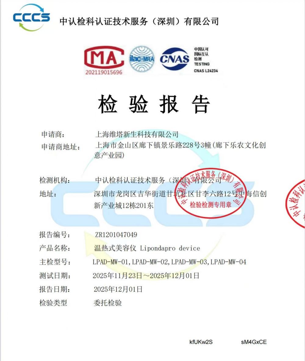 核心技术赋能,精准击破局部塑形难题 Lipondapro维塔新身塑形美容仪的核心竞争力,在于其搭载的原创Coolwaves冷微波技术与PGW精准千兆波技术,这两大技术的结合让塑形实现了“精准靶向”的效果。其专属频率的能量具有独特的吸收特性,80%会被脂肪分子吸收,仅20%作用于皮肤浅层,能精准穿透皮肤直达皮下脂肪层,避免了对表皮的过度加热,从原理上实现了塑形的精准性,可有效实现局部减围、肌肤紧致、橘皮改善的多重塑美功效。 同时,产品配备深浅双重手具,形成了协同塑美的效果。Deep手柄头可将能量深入穿透皮下12mm,精准作用于深层脂肪,助力身体自然代谢多余脂肪细胞,快速攻克腰腹、大腿等部位的深层脂肪堆积问题,打造平坦紧致的线条;Shallow手柄头的能量作用于皮下7mm,可靶向改善皮肤松弛问题,刺激真皮层胶原新生,提升皮肤弹性与光滑度,同时有效梳理脂肪团结构,抚平橘皮。双重手具针对不同塑形需求灵活搭配,10分钟即可完成局部重塑,既能解决双下巴、腰腹赘肉、妈妈臀等局部脂肪堆积问题,又能改善橘皮组织、收紧松弛皮肤,实现线条与肤质的双重提升。 多重资质认证,筑牢安全变美防线 安全是美体塑形的首要前提,Lipondapro维塔新身塑形美容仪从产品设计到入市销售,层层把控安全标准,凭借完善的权威资质筑牢了消费者的变美防线。在产品设计上,仪器内置恒温15℃接触式冷却系统,全程保护皮肤表皮不受热损伤,让整个塑形过程只有微微的温热感,无需忍痛变美;同时仪器的能量输出、冷却性能、定时功能等均经过精密调校,确保使用过程的稳定性与安全性。 进入中国市场后,Lipondapro维塔新身塑形美容仪还接受了国内权威检测机构的全面检验,由中认检科认证技术服务(深圳)有限公司出具的正规检测报告显示,产品在电气安全、电磁兼容、限用物质含量、皮肤刺激性等32项检测项目中均判定合格,手具表面温度、能量密度输出精度等关键指标均符合国标要求,细胞毒性反应等级为1级、皮肤致敏与刺激试验均为0级,结合品牌已有的英国商标、中国商标、CE、UKCA认证及中国药监局相关合规证书,形成了多维度的权威资质保障,充分验证了产品的安全性与合规性。