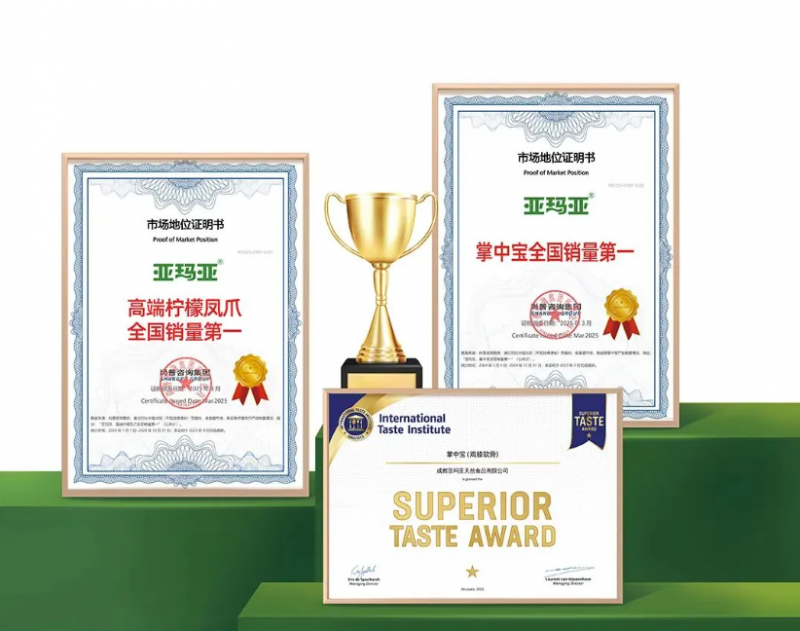 5、市场反馈往往是对企业战略最好的检验。 2025年,亚玛亚斩获了“高端柠檬凤爪全国销量第一”与“掌中宝全国销量第一”的双料认证。2024年,亚玛亚食品联合多方共同发布《柠檬凤爪》团体标准,这一举动,推动了柠檬凤爪品类的创新与发展,更为整个行业树立了全新的标准与典范。而这些,一步步夯实了亚玛亚作为柠檬凤爪品类开创者的底气和实力,打造了企业的护城河。